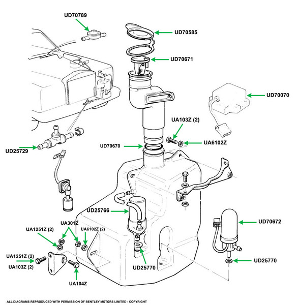 This is a good used Headlamp and Windscreen Reservoir (UD70433), with both pumps (UD25766 & UD70672), filler cap (UD70565), filler neck (UD70669), seal for the filler neck (UD70670), filter for the filler neck (UD70671) as well as the mounting bracket (UD70435).